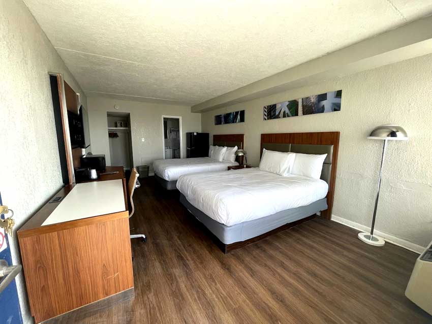 This spacious room with two queen beds is a great option for families or friends traveling together. While it faces the parking lot, it offers easy access to all the beachside fun just steps away. Enjoy the convenience of a full-size refrigerator and microwave—perfect for storing drinks, snacks, or quick meals. Comfortable, practical, and budget-friendly, this room has everything you need for a relaxing stay near the ocean.